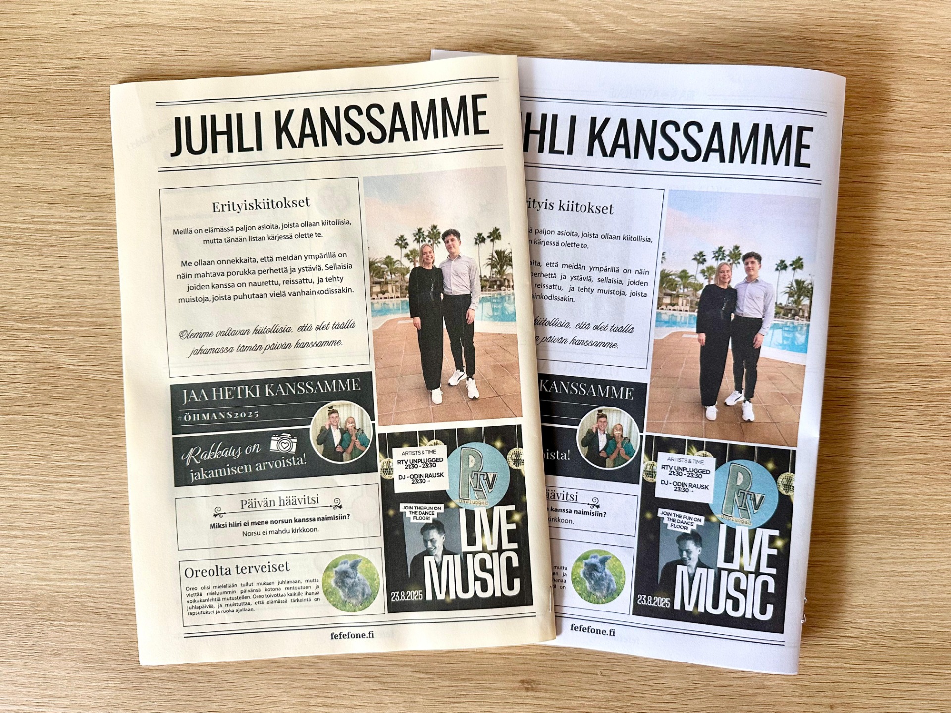 Lehti tulee olla valmis viimeistään kaksi viikkoa ennen juhlapäivää, jotta ehdimme tulostaa ja toimittaa sen ajoissa.
