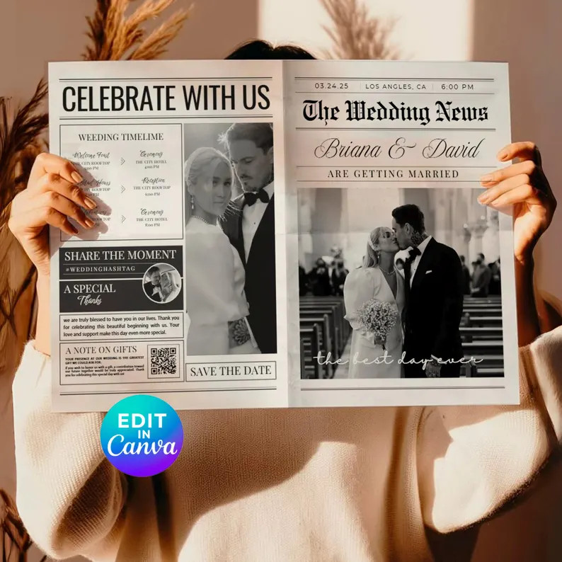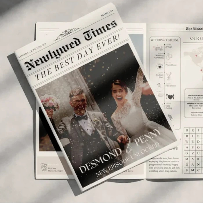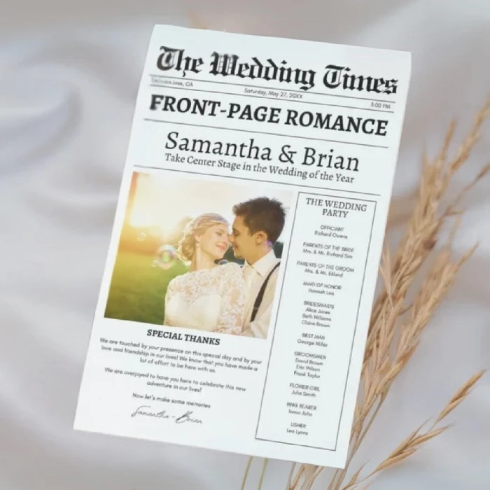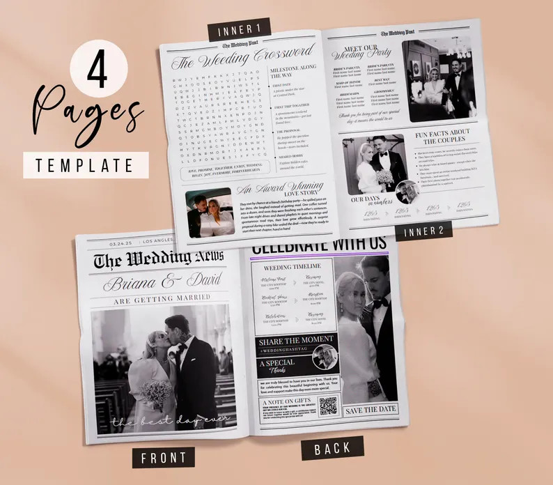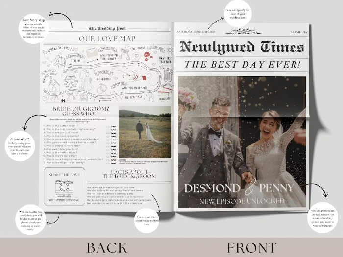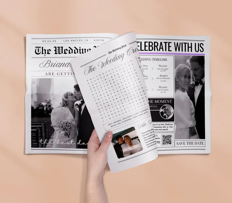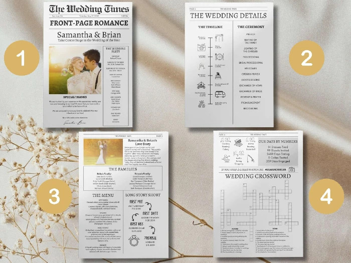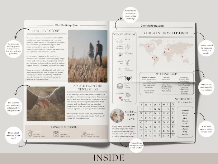 Your newspaper can include everything from the wedding schedule, menu and your love story to fun activities like a wedding bingo or crossword puzzle to keep your guests entertained.