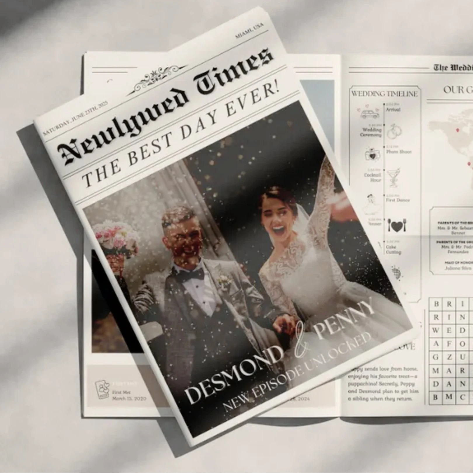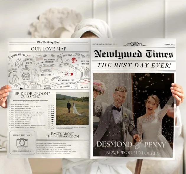 Hääsanoma on täydellinen tapa tuoda persoonallisuutta juhlaasi. Lisää omat kuvat ja nimet, ja muokkaa tekstejä juuri teidän tyyliinne sopivaksi – me hoidamme tulostuksen! Lehti voi sisältää kaiken tarvittavan tiedon, kuten juhlan aikataulun, menun, hääparin tarinan sekä hauskoja tehtäviä, kuten hääbingon tai sanaristikon, jotka viihdyttävät vieraita. Luo helposti teidän näköisenne kokonaisuus, joka jää vieraiden mieleen pitkäksi aikaa!